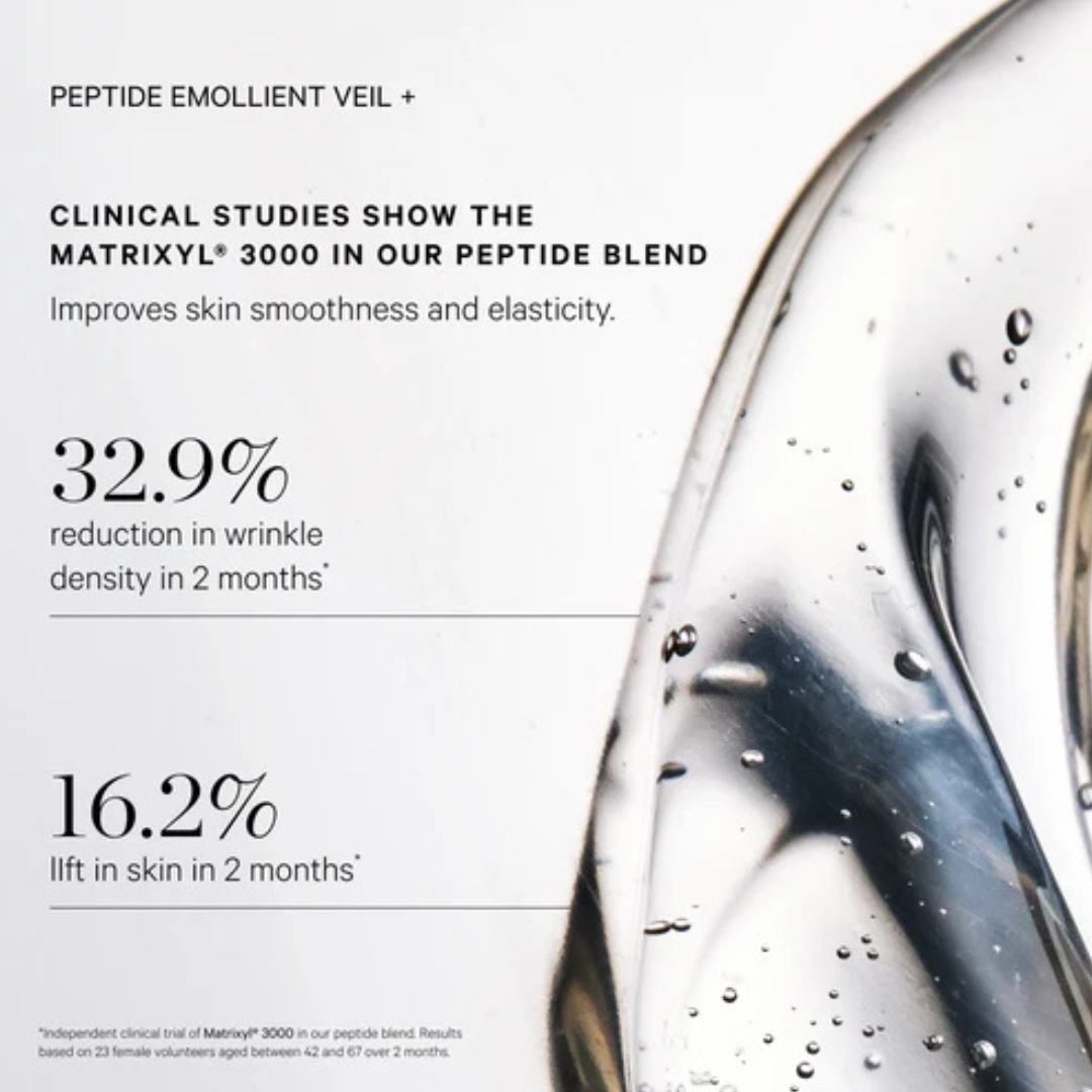 A deeply hydrating and nourishing, collagen-boosting moisturiser. Designed for drier skin types or those in need of an extra hydration boost. This richer version of the original Peptide Emollient Veil delivers intensive moisture, barrier support, and firming benefits, making it the perfect choice for dry skins, dehydrated skin due to travel, environmental stress, or fatigue.